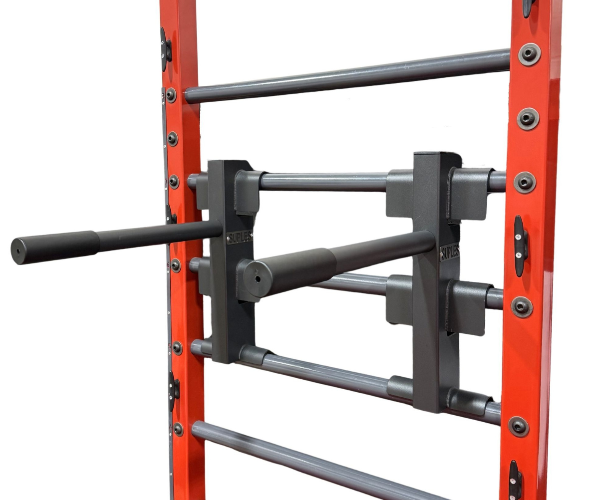The Suples WALL DIP BAR is designed to be mounted directly to the Suples Wall. It allows you to perform regular dips or supported dips with your feet still on the floor. The Dip Bar provides great chest, shoulder, and abdominal training. It is made to accommodate athletes with different shoulder widths, allowing you to easily set your desired width by moving the bars closer together or farther apart.