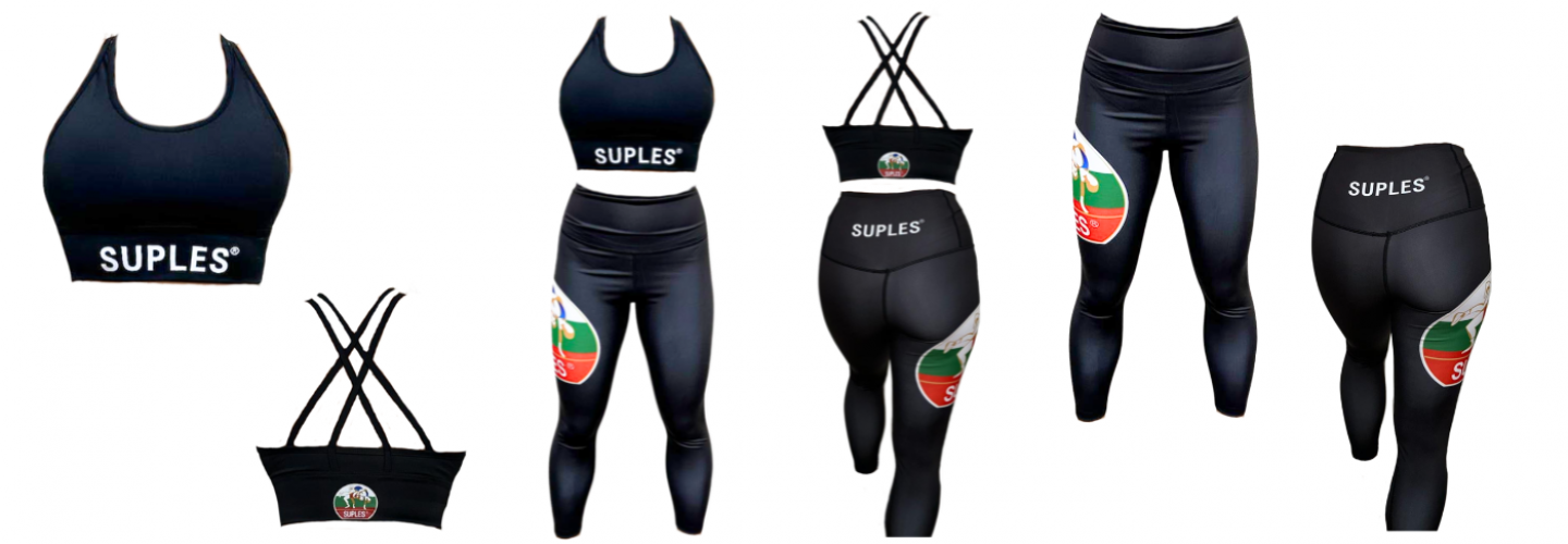 This matching set is available In three different sizes: small, medium, and large. Both the sports bra and the leggings have a ribbed design on the outside, but are smooth on the Inside.